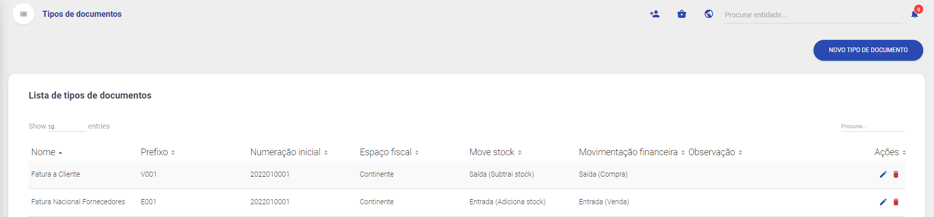 Poderá editar os documentos e definir a numeração inicial do documento, espaço fiscal, qual o tipo de movimentação e colocar uma pequena observação.