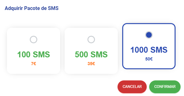 Caso já não tenha mais SMS para enviar, poderá sempre solicitar mais! Selecione a opção que deseja e será redirecionado para a página de pagamento. Após concluido e confirmado o pagamento, já poderá enviar mais SMSs para as suas entidades.