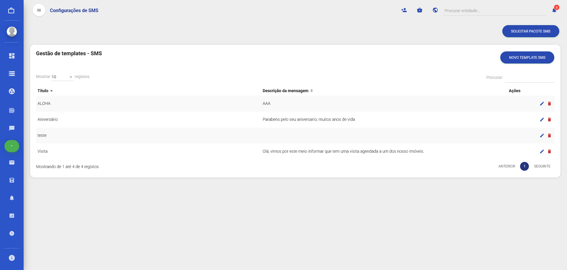 Na página de configuração de SMS, poderá definir e personalizar os diferentes tipos de mensagens que deseja enviar. Estas configurações ficam disponíveis para seleção ao programar um novo envio diretamente no perfil de cada entidade.